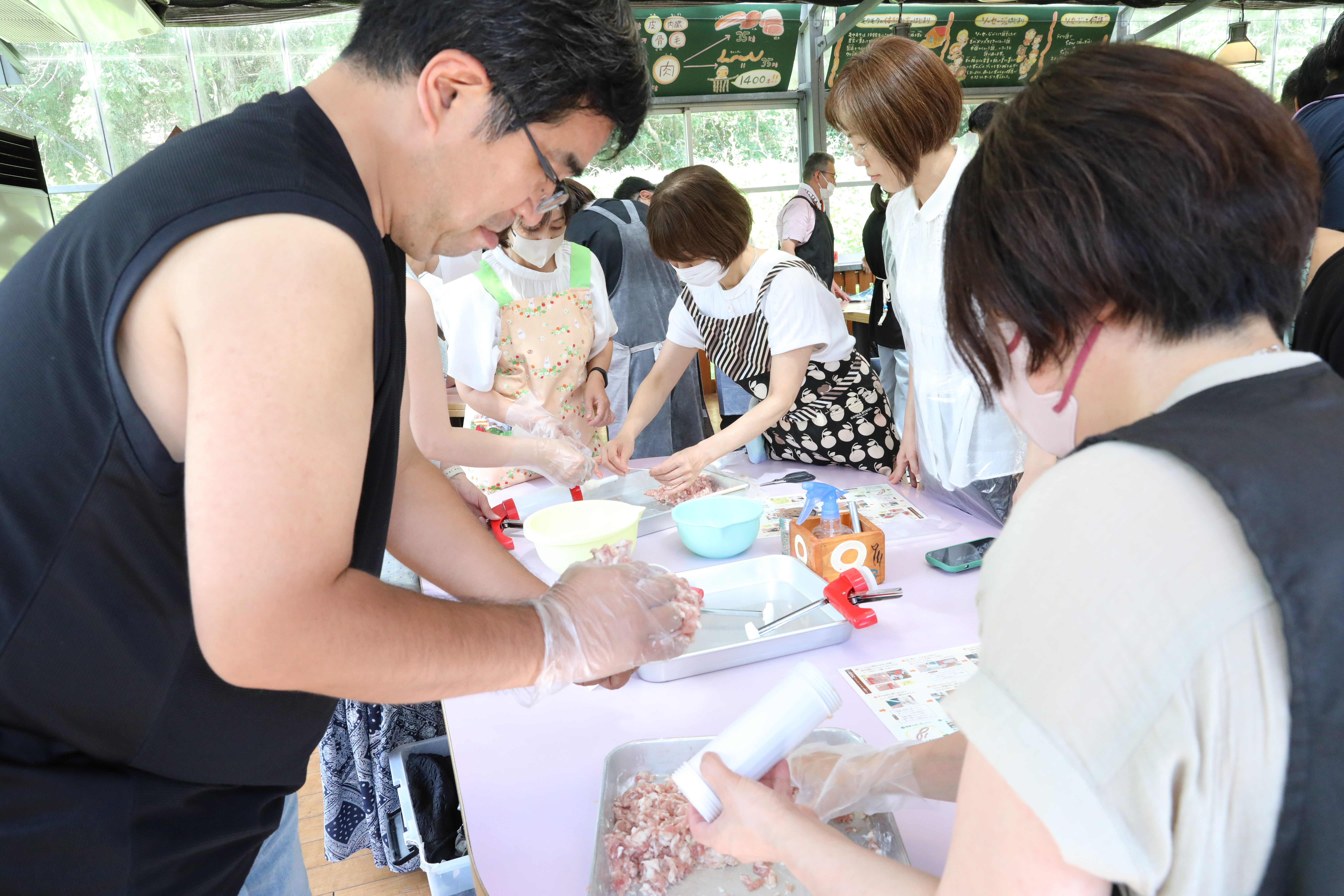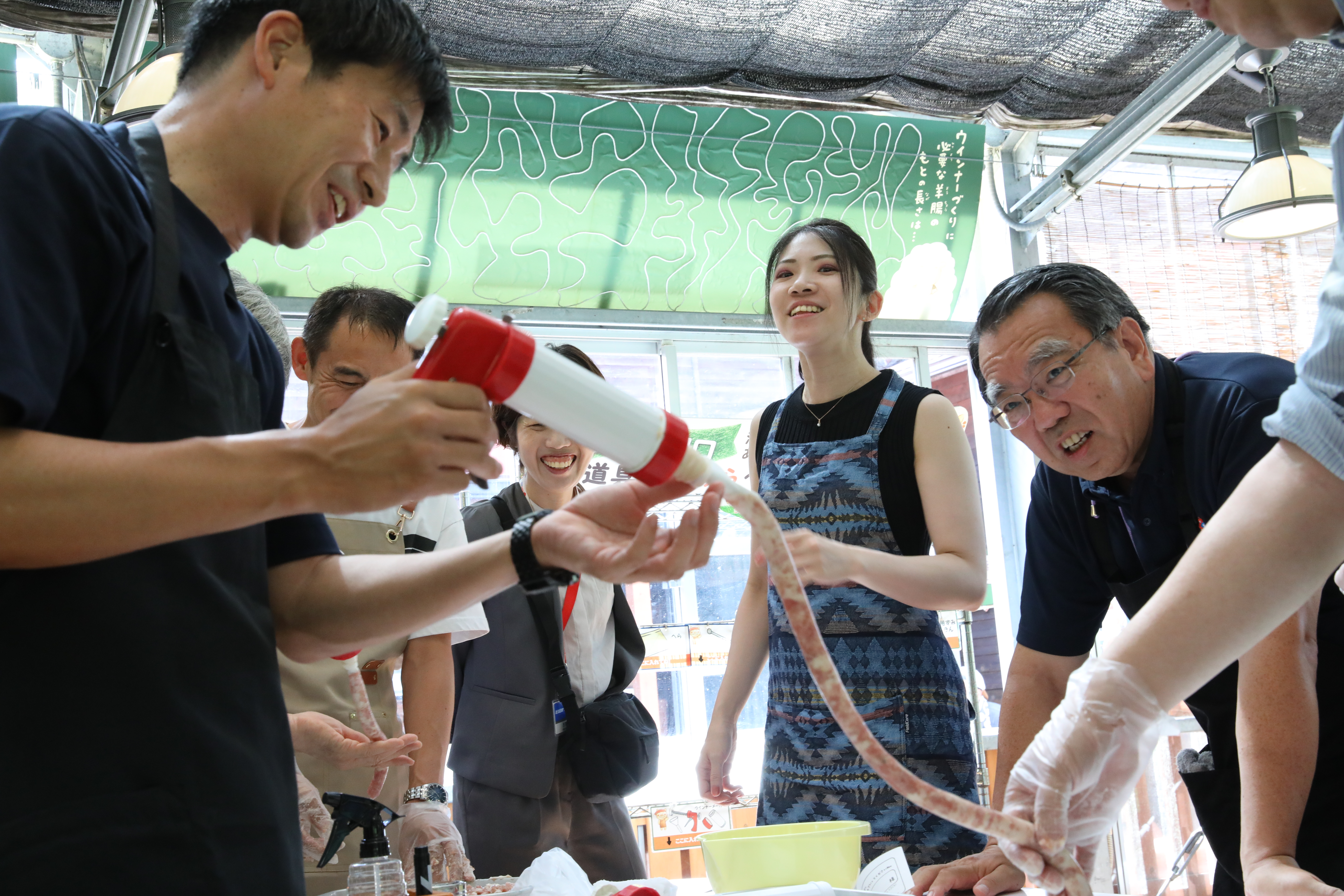 その後このバス旅行本命 ウインナー作りをしました、おじさん達のエプロン姿見て笑いが出ましたが、皆さん頑張って手で肉を混ぜたり 機械の中に肉詰めて腸の中に押し出しながらウインナーを作りました 途中で腸が切れたりしましたが おいしいウインナーが出来上がってました、各位作った1本だけ試食しましたが旨いと感動されている方もいました。残りのウインナーはお持ちかえり用保冷バック&保冷剤に詰め土産としました。